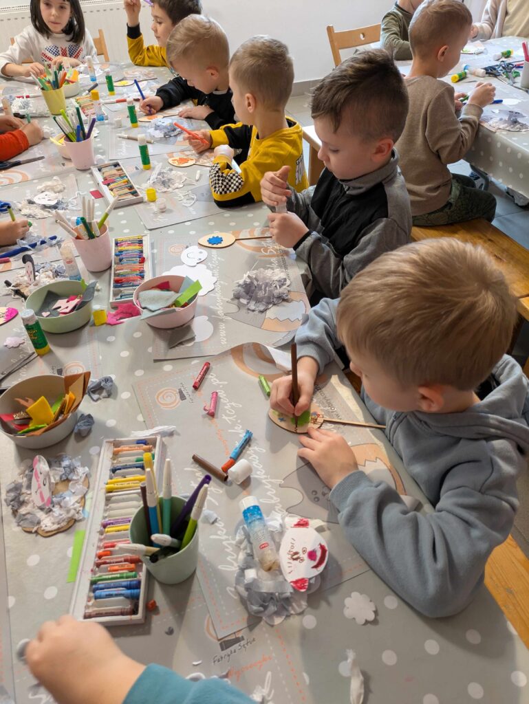 „Róże” odwiedziły Fabrykę Sztuk, aby wziąć udział w warsztatach „Wielka szyszka”, łączących sztukę, przyrodę i pracę zespołową. Dzieci po poznaniu budowy szyszki, stworzyły kolorowe łuski, ozdabiając je różnorodnymi materiałami. Następnie