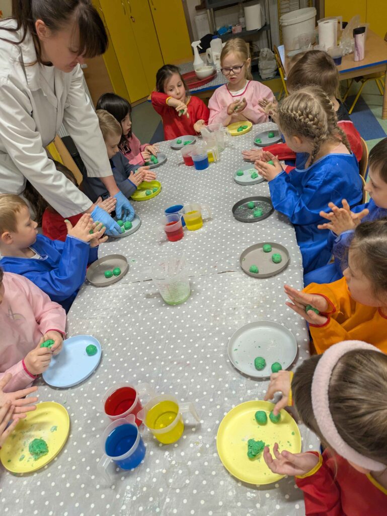 Podczas warsztatów laboratoryjnych dzieci mogły dowiedzieć się, w jaki sposób otrzymać poszczególne barwy wiosenne. W trakcie eksperymentów panie prowadzące opowiedziały sporo ciekawostek na temat soli berylowców i reakcji , w których one biorą udział. Każde dziecko miało możliwość zabawić się w małego chemika. W odpowiednich menzurkach mieszały różne substancje i odkrywały, jak zmieniają się ich barwy i konsystencja w trakcie dodawania tajemniczych proszków i płynów. Ciekawostką był pokazany przy zgaszonym świetle proces spalania niektórych substancji, które mieniły się wieloma barwami.
