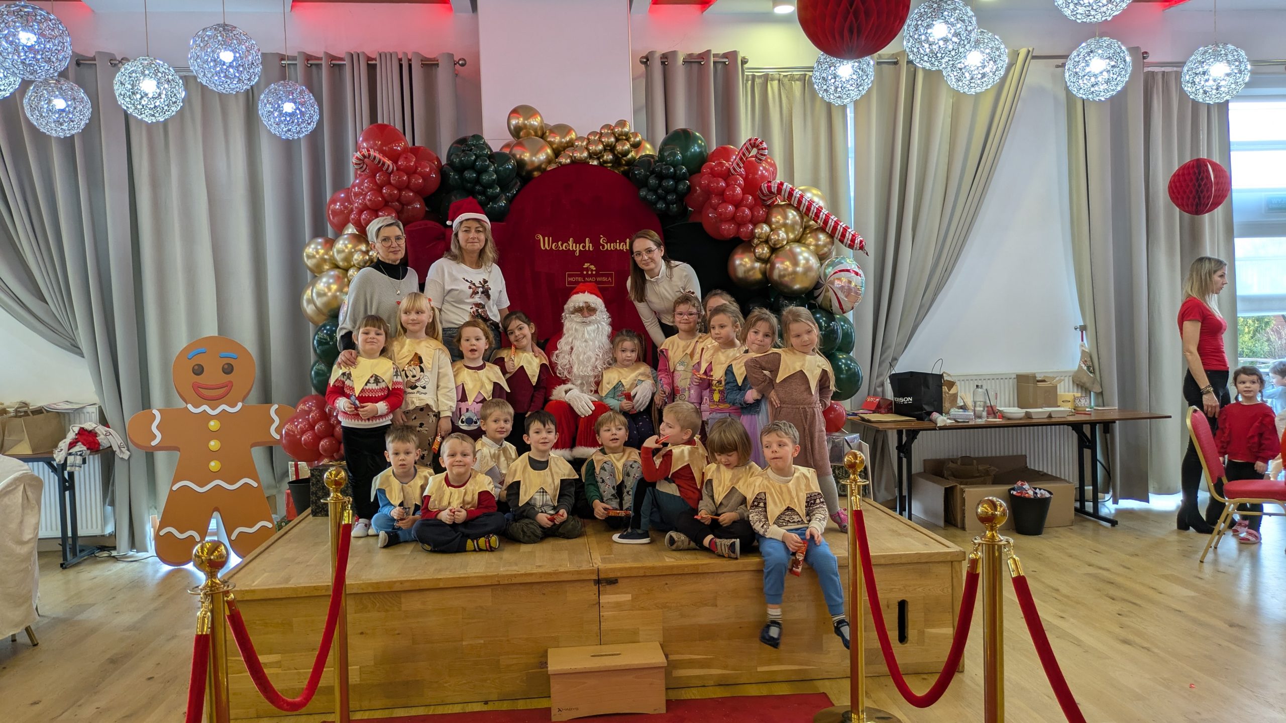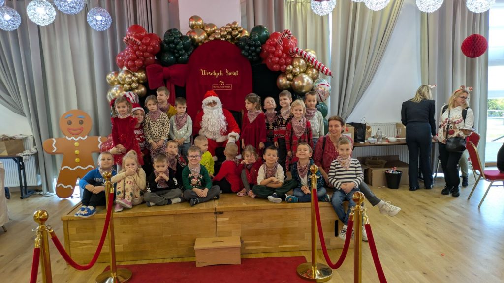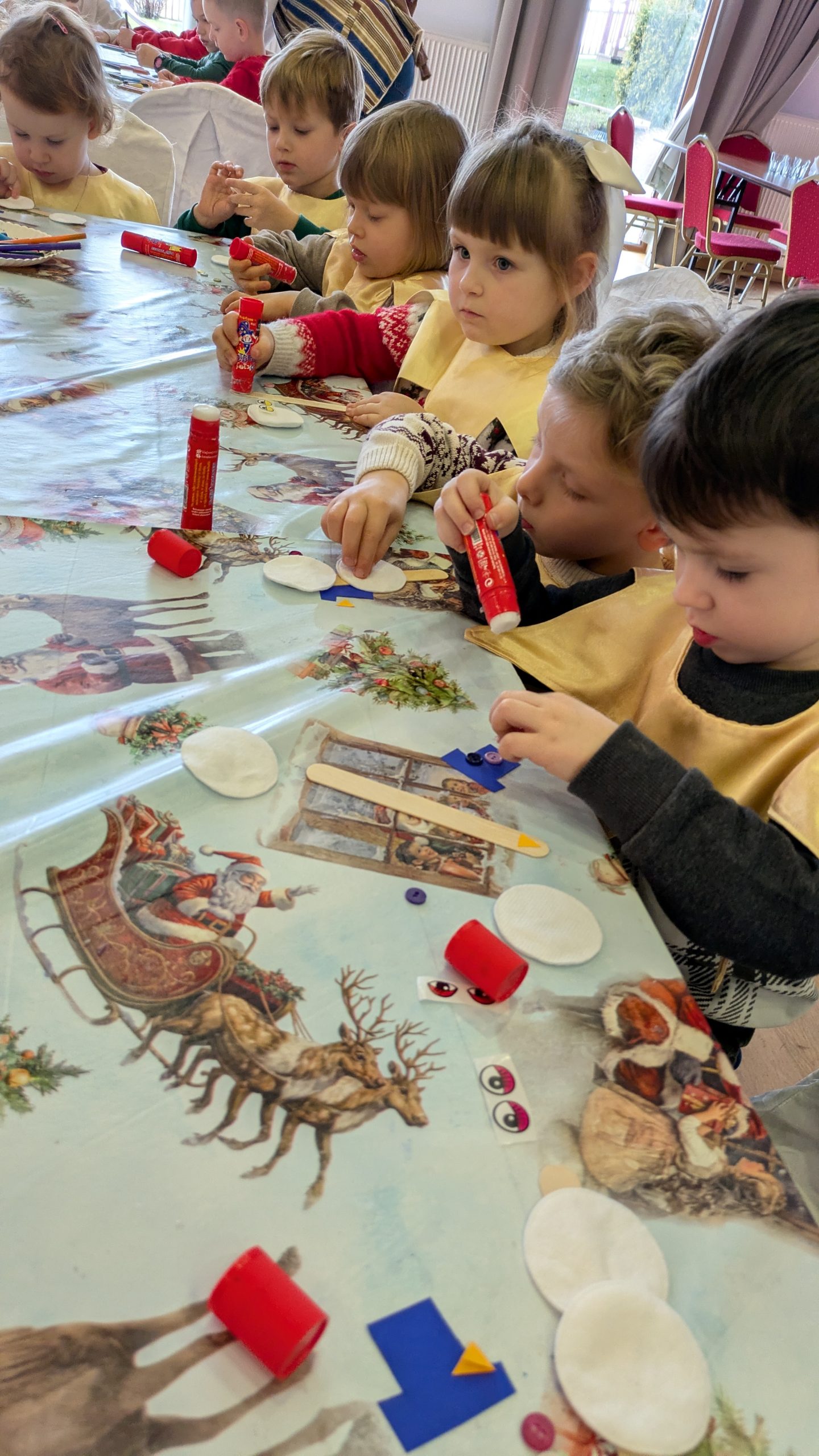 „Niezapominajki” i „Róże” udały się do Gościńca nad Wisłą, na Mikołajkowe warsztaty świąteczne. Przy pięknie przygotowanych stanowiskach dzieci mogły napisać list do św. Mikołaja, ozdobić świąteczne pierniki, ulepić figurki z masy solnej i wykonać sylwetę zimowego bałwanka. Spotkanie z Mikołajem, miłe rozmowy, upominki i pamiątkowe zdjęcia były kulminacyjnym punktem naszej wycieczki. Wiele radości dostarczyła dzieciom zabawa na dmuchańcu, po której obiadowe naleśniki smakowały wyśmienicie. To był naprawdę miły świąteczny czas.