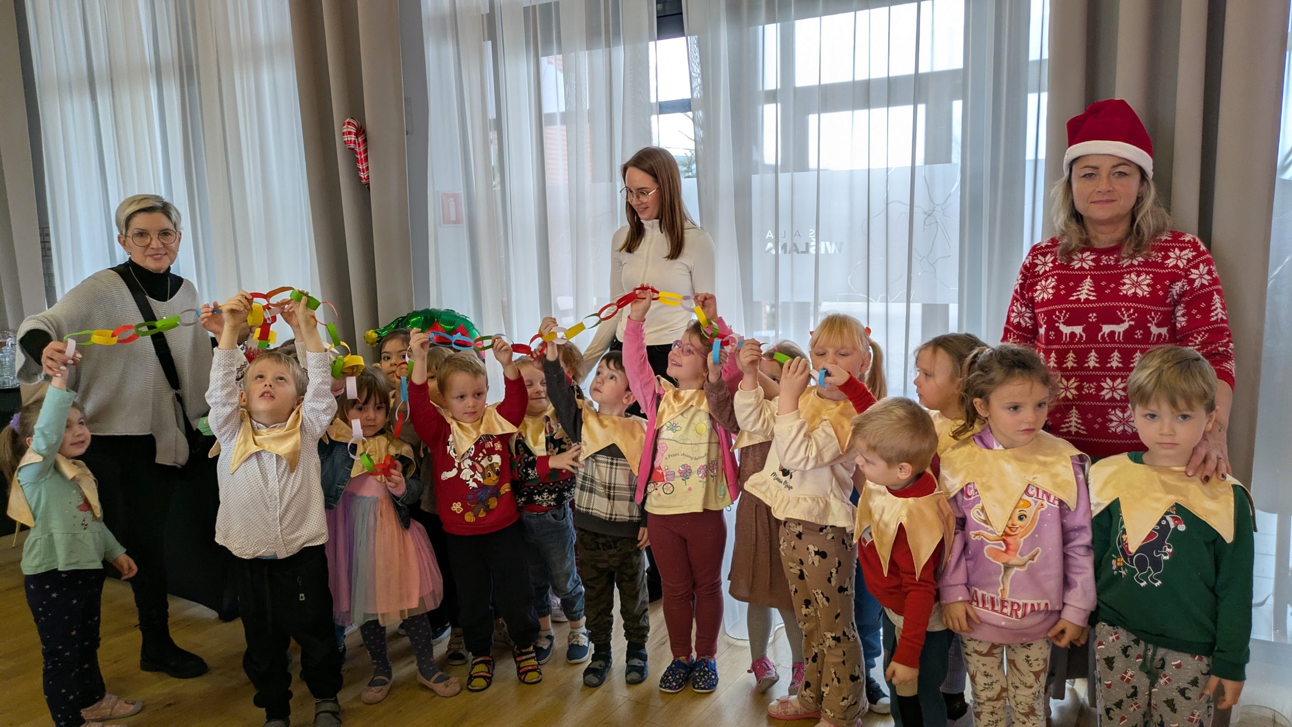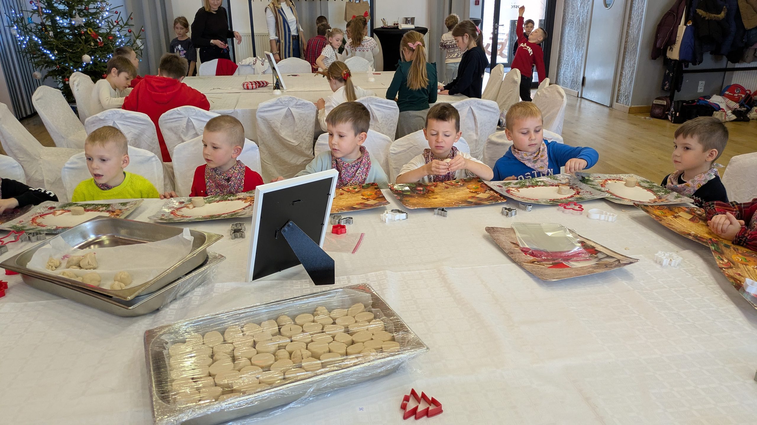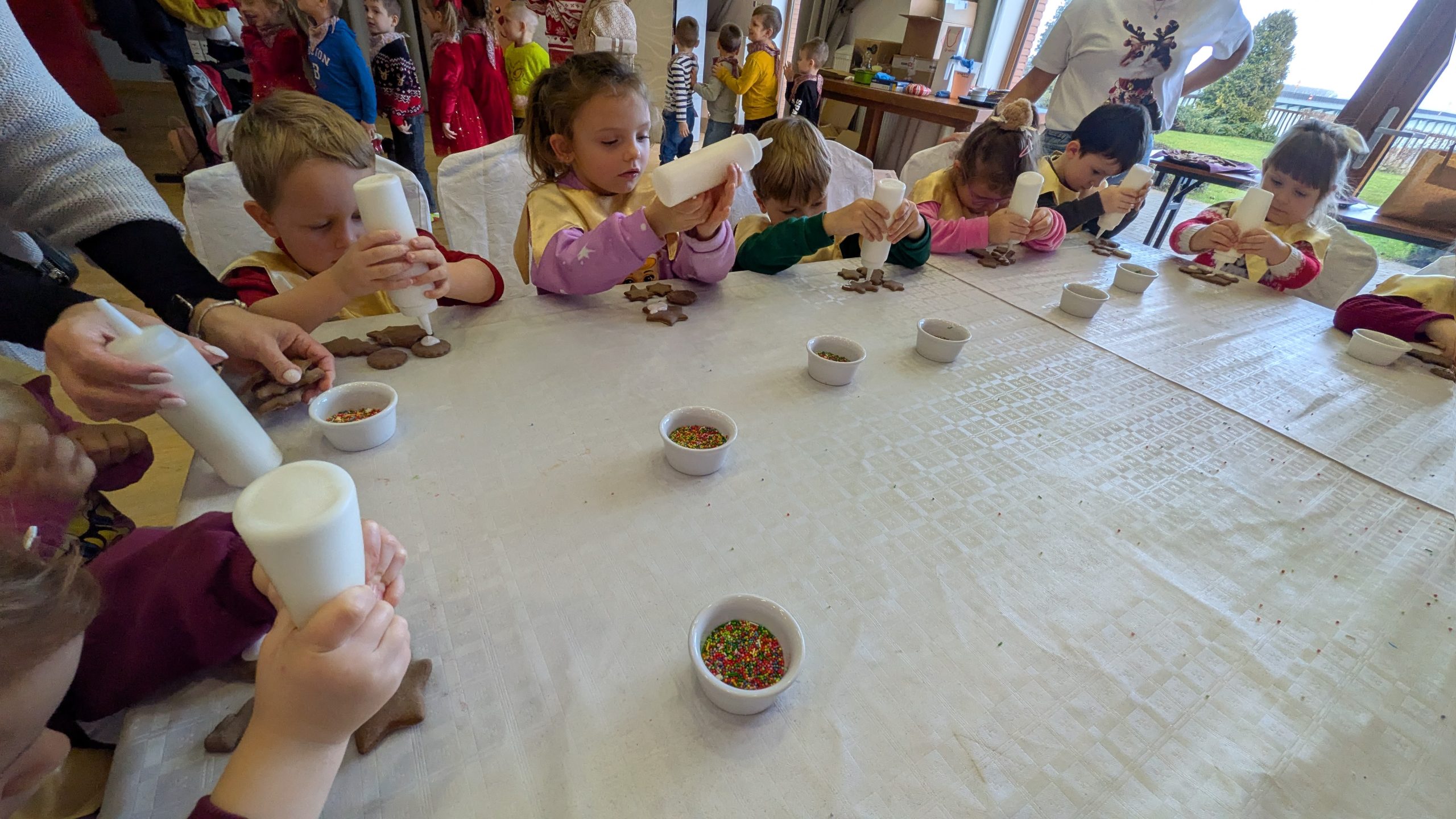 „Niezapominajki” i „Róże” udały się do Gościńca nad Wisłą, na Mikołajkowe warsztaty świąteczne. Przy pięknie przygotowanych stanowiskach dzieci mogły napisać list do św. Mikołaja, ozdobić świąteczne pierniki, ulepić figurki z masy solnej i wykonać sylwetę zimowego bałwanka. Spotkanie z Mikołajem, miłe rozmowy, upominki i pamiątkowe zdjęcia były kulminacyjnym punktem naszej wycieczki. Wiele radości dostarczyła dzieciom zabawa na dmuchańcu, po której obiadowe naleśniki smakowały wyśmienicie. To był naprawdę miły świąteczny czas.