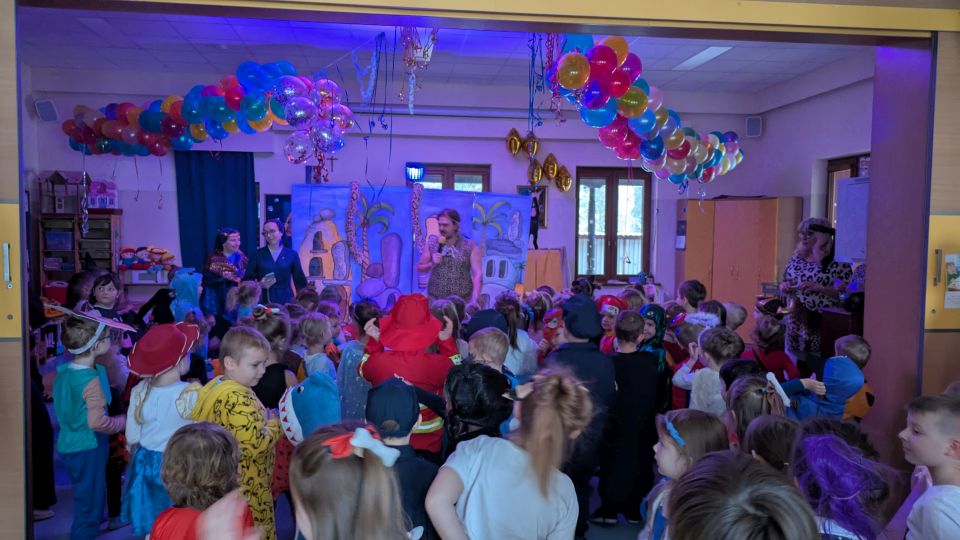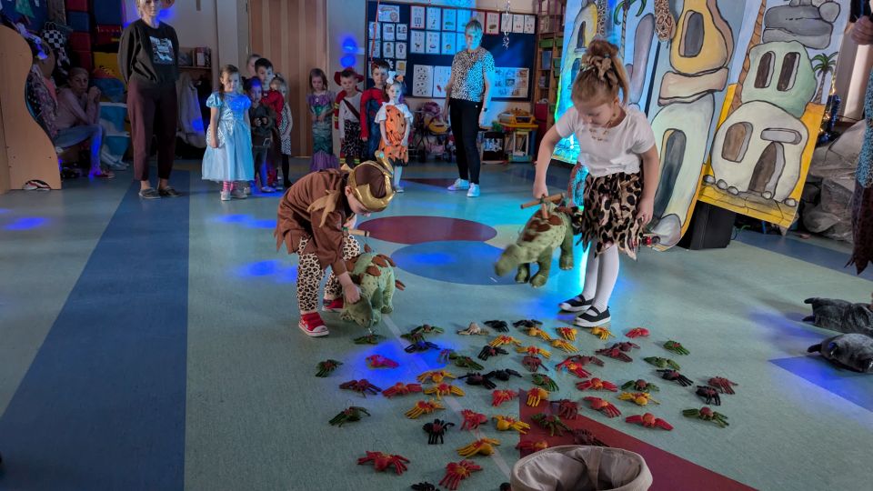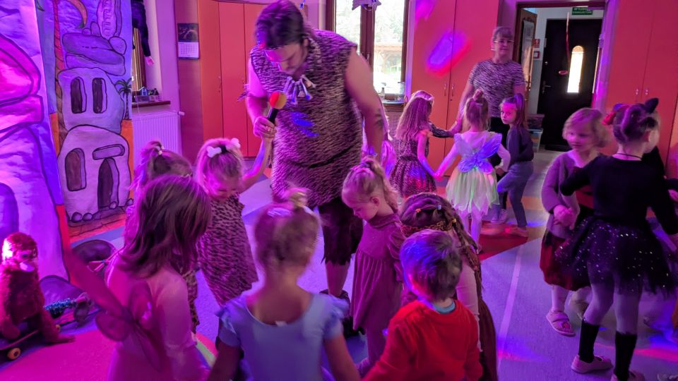 W tym roku w czasie balu przenieśliśmy się w odległe czasy i zawitaliśmy do krainy Jaskiniowców. Tam czekały na dzieci różne zadania m.in. pomoc małpkom w zebraniu bananów, nakarmienie dinozaurów, poskromienie węża, zdobycie pożywienia dla całej rodziny. Wszystko przeplatane było piosenkami, które podrywały wszystkich do tańca. Po wspólnej zabawie nadszedł czas na świętowanie w grupach przy wspólnym stole i uzupełnienie energii, by dalej bawić się tym razem już w swojej sali.