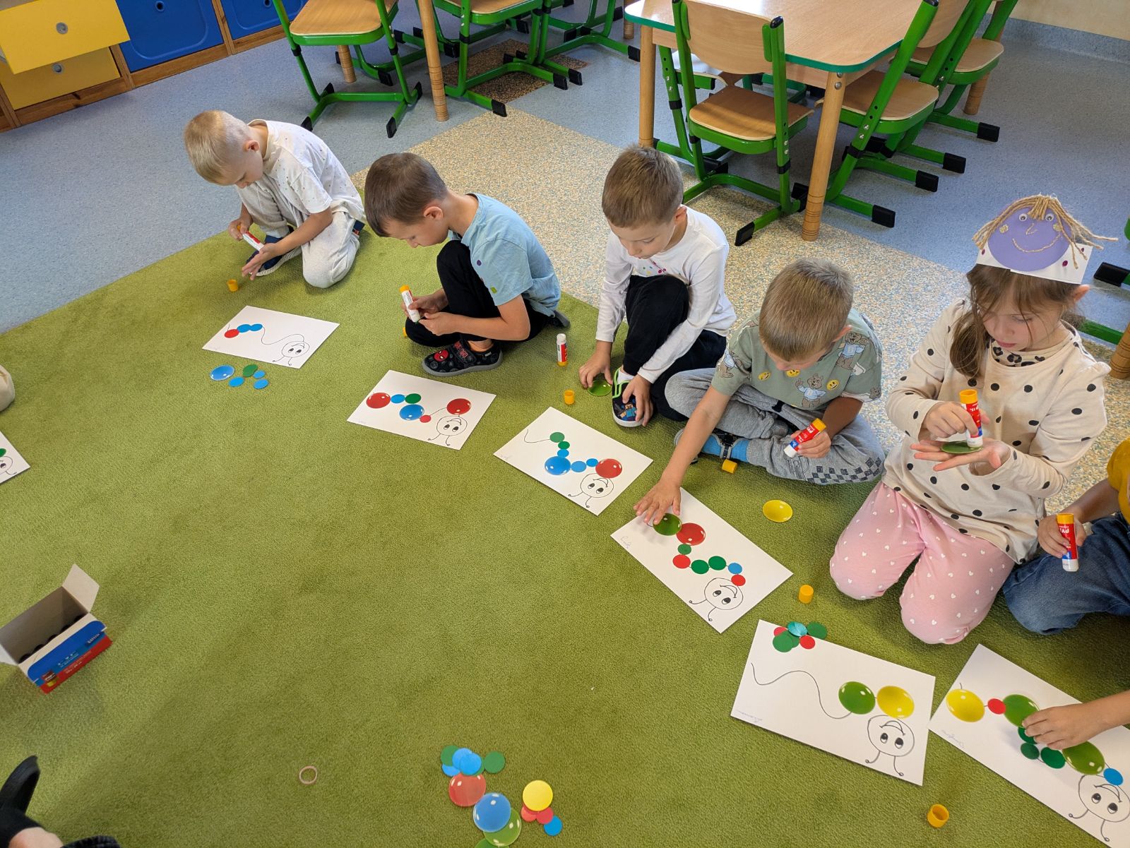 „Stokrotki” poznały historię dnia kropki, dzieci opowiadały o swoich talentach. Ratowaliśmy kropki, które wypadły za burtę statku, kropki tańczyły na chuście animacyjnej, szukaliśmy kropek w określonym kolorze i tworzyliśmy pracę